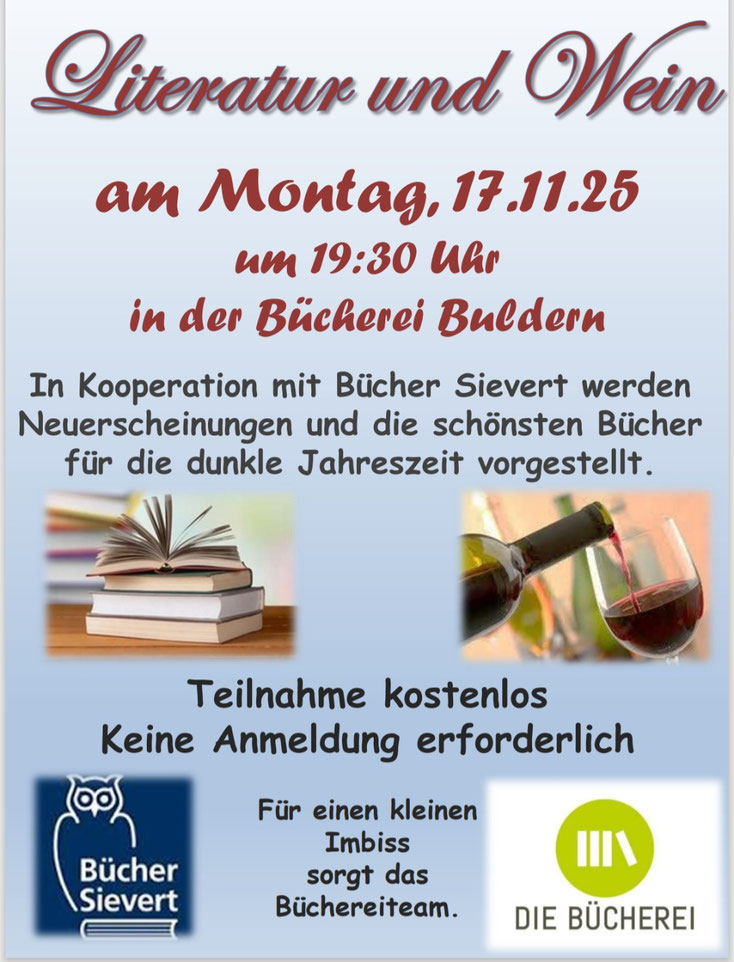 Zwei fachkundige Mitarbeiter der Buchhandlung Sievert greifen an diesem Abend tief in ihre Bücherkiste und stellen bei einem Glas Wein und leckerem Fingerfood Neues vom Büchermarkt vor.